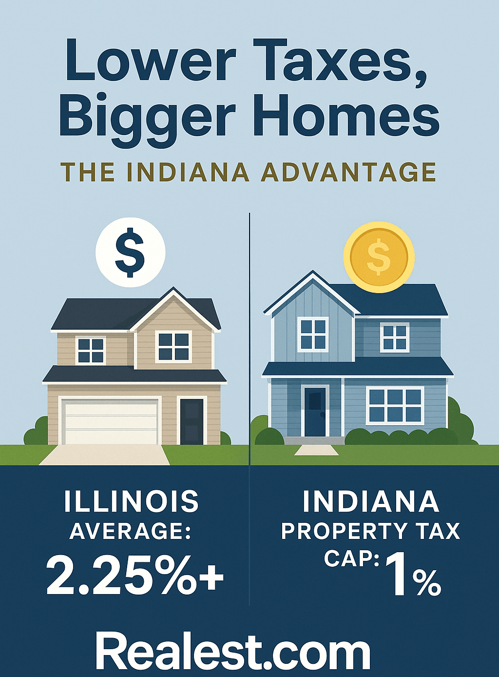 Indiana’s constitutional “circuit breaker” caps property taxes at 1% for owner-occupied homesteads, 2% for other residential/ag, and 3% for all other property—a huge advantage versus many Illinois suburbs. That can mean thousands saved every year. Sources